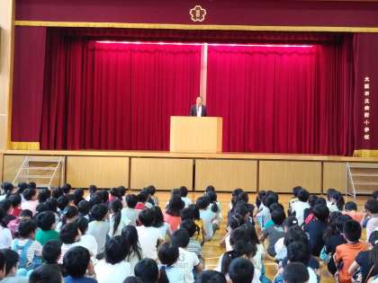 今日は、先日発生した川崎市事件と通して、登下校の安全に充分注意すること、あぶないと思ったら、ランドセルを捨てて走って逃げる。近くの大人の人に助けを求める。お店や、民家に逃げ込むことで、「自分で自分の身を守る」話がありました。また、保健委員会が、4つの色に分けて表示する「暑さ指数」の説明をしました。今年も熱中症には充分注意が必要です。