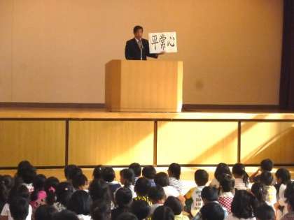 毎週の全校朝会では、校長先生からいろいろなお話をしています。今日は、運動会にむけてがんばりましょうとお話しました。禅のお話をしました。禅では悟りを得るために修行をつむのです。悟りとは「動じない心」をつくることです。そのための大切な心がけとして「平常心」のお話をしました。ふだんやっている事を、ふだんの気持ちで丁寧にやっていくことが大切です。心を乱されないように落ち着けてがんばってくださいね。