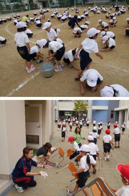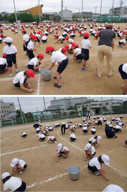 運動会全体練習のあとに、全員で運動場の小石をひらいました。イスは先生方にあしをふいてもらってから教室にかえりました。