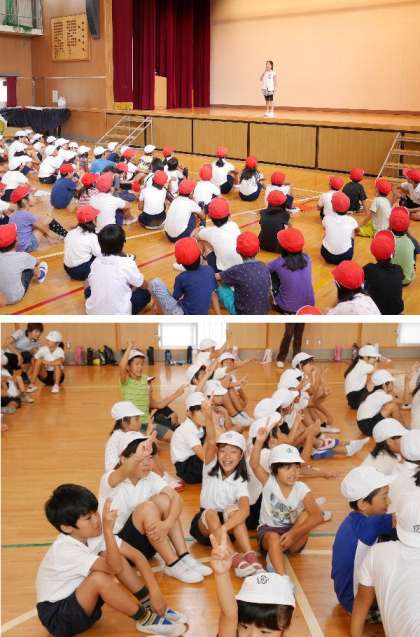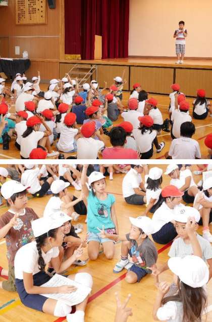 運動会の全体練習がつづくなか、2学期はじめての児童集会がありました。焼野小学校のあれこれを三択クイズで答えます。6年生のリーダがやさしく1年生に話しをしたりいい感じです。