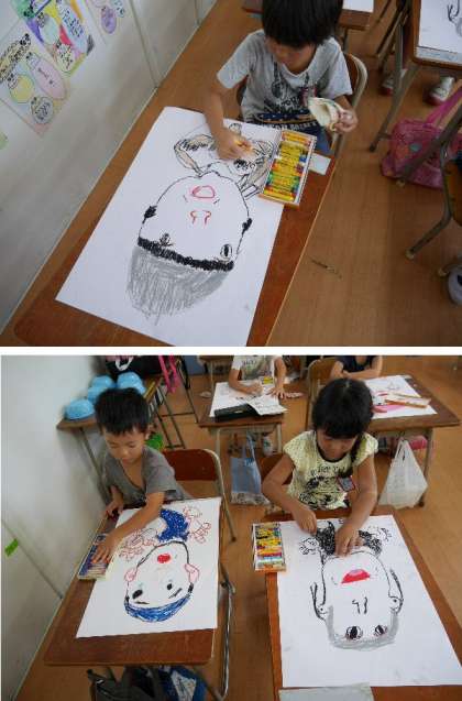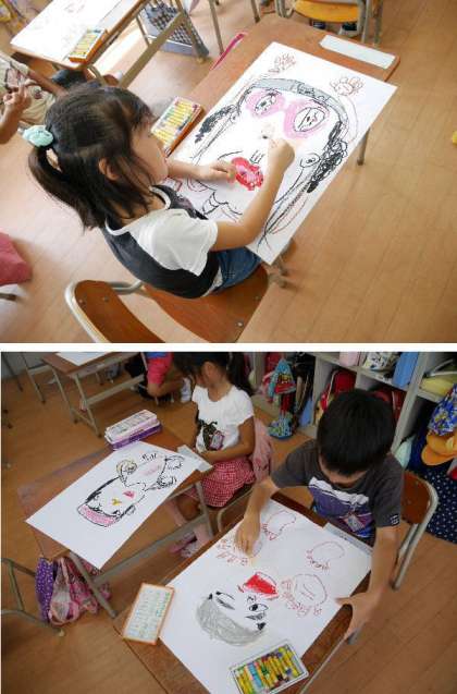 1年生が図工でプールでシャワーをあびている絵を描いています。両手、両足がわっとひろがって、こちらにむいています。クレパスで身体を上手に描いています。なんか迫力ありますね。仕上がりが楽しみです。