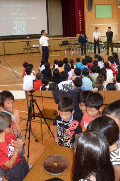 まず、鶴見区長の都倉さんより講師の方を紹介していただきました。コマの説明のあと、8班に分かれて、いろいろな特徴あるコマの中からひとつコマを選んで、トーナメント形式で対戦しました。コマを選ぶときも、よく回るコマを選ぶためなかなか決まりませんでした。対戦ではコマのまわし方が大きく勝敗に影響します。大きいからよく回るわけではないし、コマの重心も大きく影響します。