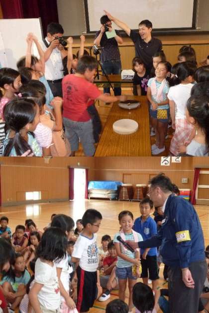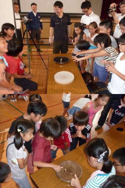 対戦はとても盛り上がりました。コマの回転をくいいるようにみて一喜一憂していました。最後に優勝チームがインタビューをうけています。
