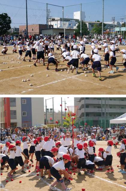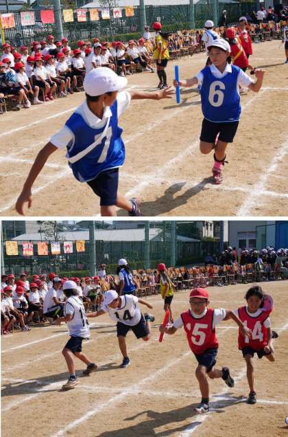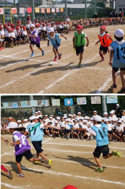 午後の部。1・2年団体競技「めざせ!かごいっぱい!」と、3・4年リレー「いっぱい走れ!ぜったいつなげ!」です。