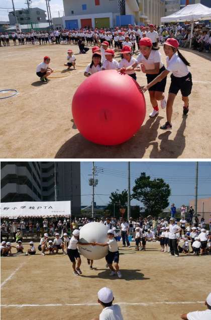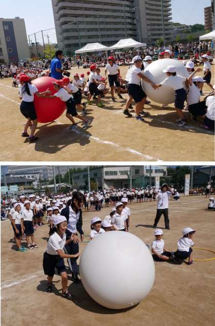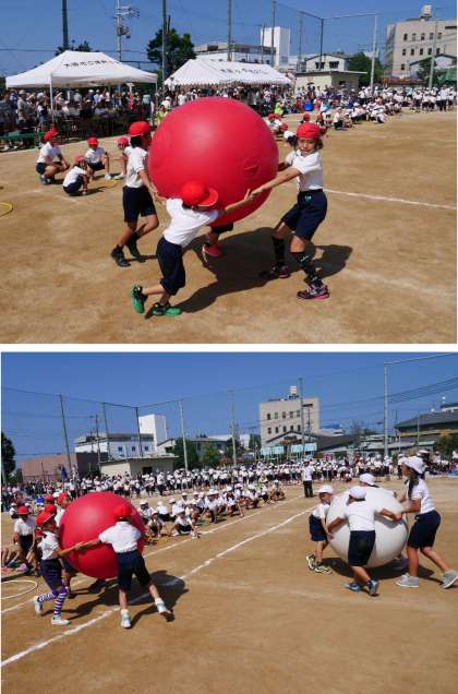 午前の部の最後の競技。全学年でたてわりの4人でチームをくんで大玉を運びます。その名も「ジグザグるっと みんなでワッショイ!」です。楽しそうです。