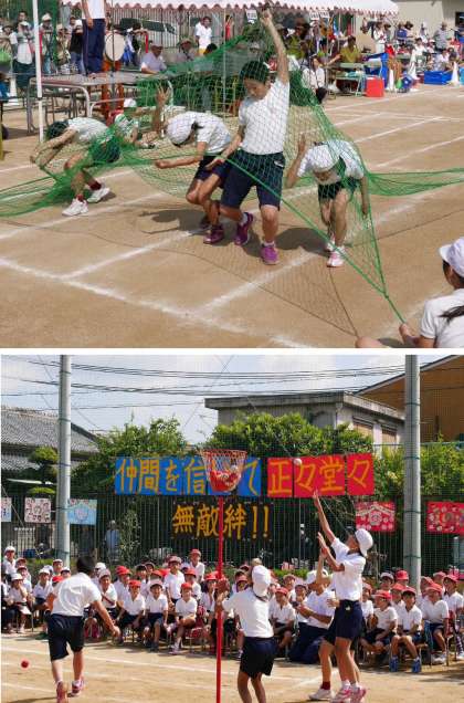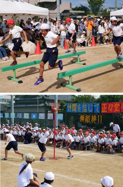 5年生の個人走「くぐって わたって 玉をはずしちゃ ダメよダメダメ〜!」です。網をくぐり、平均台の上を走りとたいへん。意外や意外、玉入れに玉がまったくはいらない、困った困ったと思いつつ最後までがんばったよ。