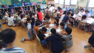 歌詞カードも自分たちで書きました。最初は、思わず漢字を使ってしまいましたが、1年生が、まだ漢字を習っていないことを思い出し、ひらがなばかりの歌詞カードを書きました。