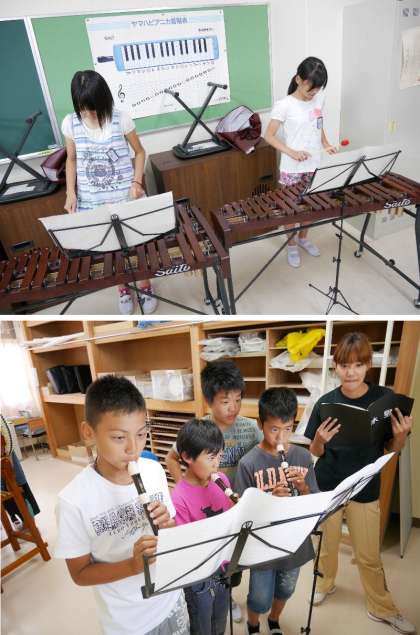 各学年の音楽の時間では音楽発表会にむけて練習がはじまっています。1年生はすずやトライアングルのならしかたを学習していました。6年生は合奏のパーと練習をがんばっています。