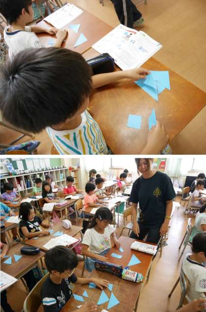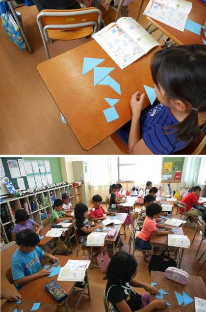 正方形を三角や四角に切り分けて、切り取った図形をくみあわせて、いろいろな形を作っています。どうくみあわせたら形になるか、みんな頭をなやましています。「まだ、答え言わんといてや!」「自分で考えるから待って!」と考えています。柔軟な発想でくみあわせる楽しさがありますね。
