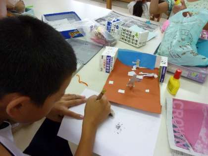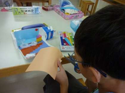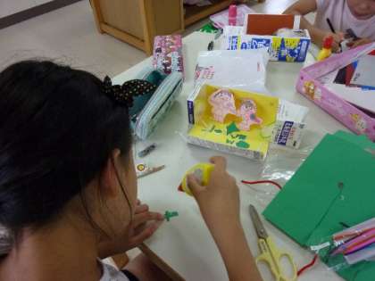 4年生の図工では、牛乳パックの一部を切り抜いて、その中に物語となるストーリを作って表現します。みんないろいろなストーリーを作っています。