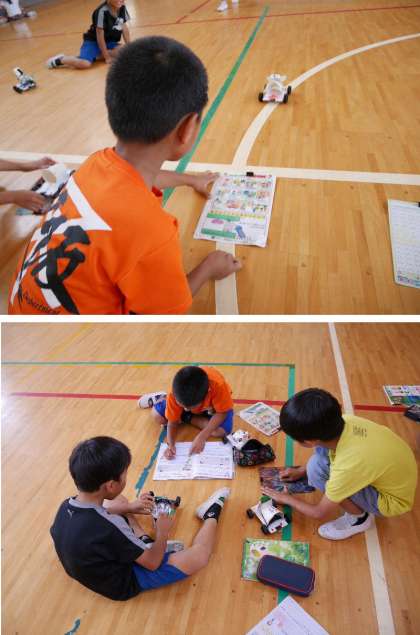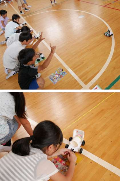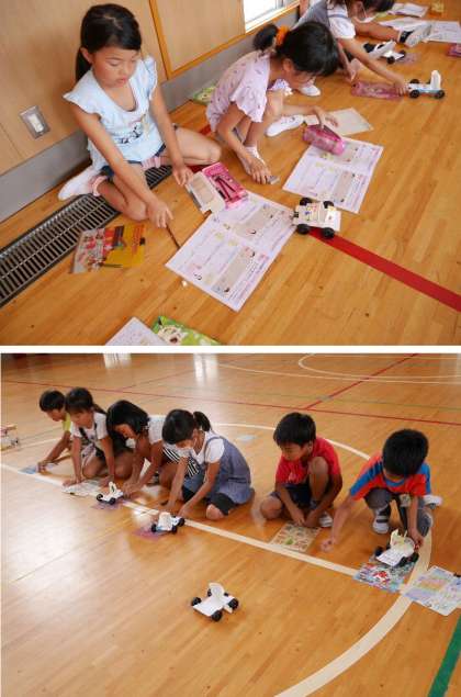 3年生では、自分たちが作った車を、短いゴムと長いゴムでどれだけ走るかを実験して記録しています。実験のあとで、ゴムの長さと車の走るキョリの関係をまとめています。