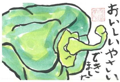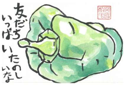 2年生が学級菜園でそだったピーマンを収穫しました。とっても大きなピーマンです。校長先生にもおすそわけ。とびきり大きなピーマンをいただきましたので、「収穫に感謝をこめて」絵はがきにしてみました。