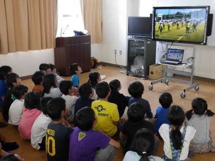 運動会の団体演技を4年生がビデオでみています。また、団体競技の「ロープひき」もみました。運動会はおわり結果はでていますが、ビデオの前で、4年生が「がんばれ!」「白まけるな!」と大きな声で声援をおくっています。もりあがって鑑賞できました。