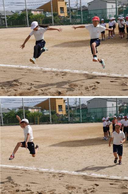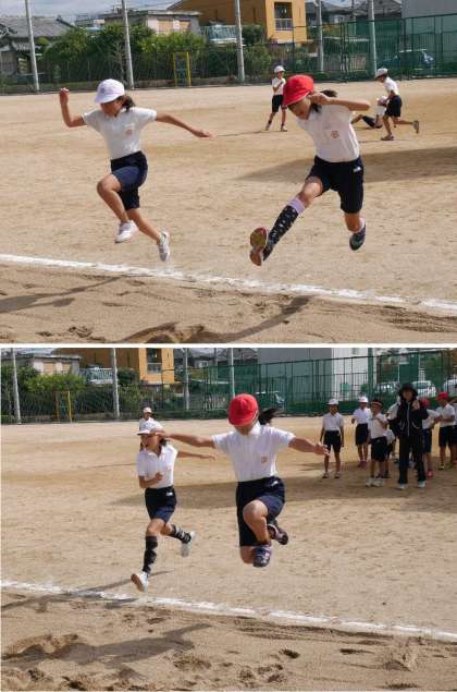 4年の体育では、走り幅跳びの練習をしています。ふみきりの足、腕はどうするのか、といろいろ試行錯誤して練習にはげんでいます。一瞬一瞬のポーズがかっこいいですね。
