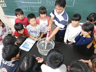 4年生が理科室で、先生が実験する手元を熱心にみています。さて、どうなるかな。課題を確かめるために真剣ですね。いろんなことに興味をもって解明していけばノーベル賞もとれるかも。