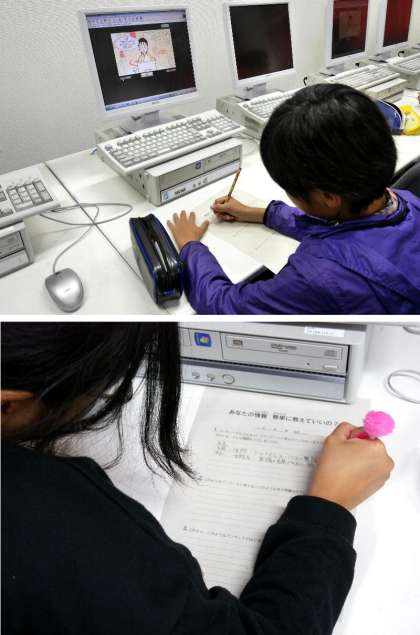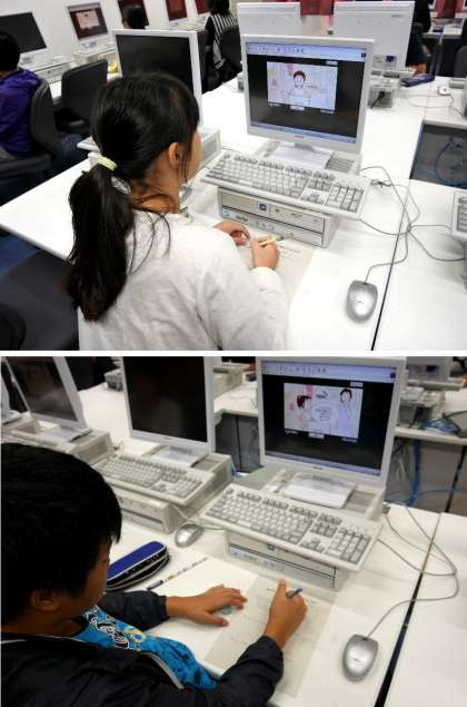 6年生がパソコン室でパソコンの画面と音声を聞きながらプリントに答えています。画面では、プレゼントキャンベーンでプレゼントが当たるインターネットサイトに申込み、自分の名前や住所、家族名などを答えたところ、なかなか景品があたらないどころか、いろいろな勧誘がくるようになったという内容でした。