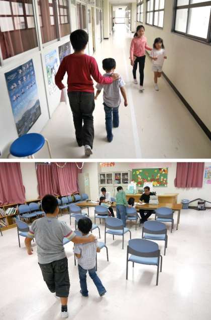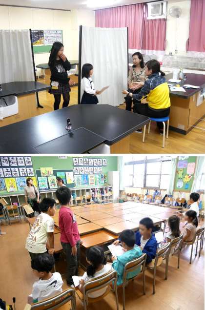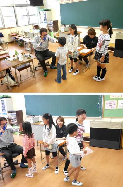 来年の新入生にとてもやさしく誘導している5年生です。少し緊張しながら、やさしい声をかけて、自分の役割をがんばっていました。