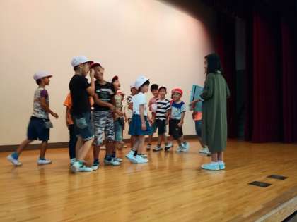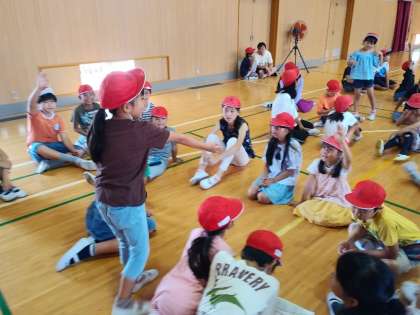 今日の児童集会は「ジェスチャーゲーム」です。集会委員が考えたホワイトボードに書かれた課題を各班に戻ってジェスチャーして答えを当てるゲーム。各班の学年ごとに代表になった人は、伝わるように工夫してジェスチャーをしていました。
