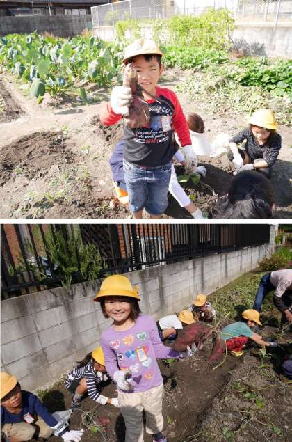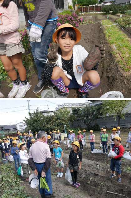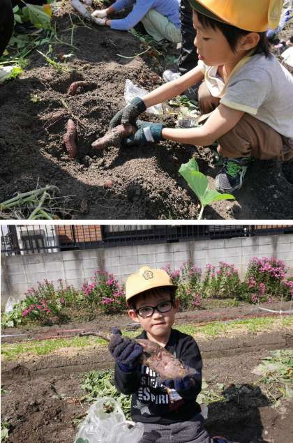 全員がサツマイモをたくさん収穫できました。なかには、顔ぐら大きなサツマイモをほった人もいます。秋の収穫は楽しいね。