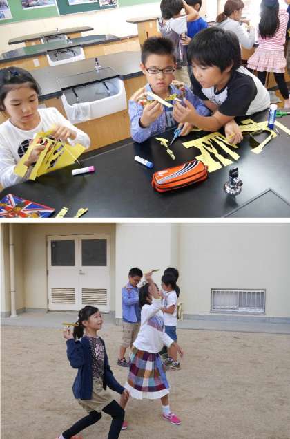 科学部は紙ひこうきを組み立てて飛ばしています。
