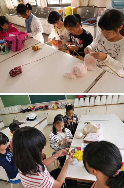 家庭部はあみものを始めました。教えてもらいながらがんばっています。