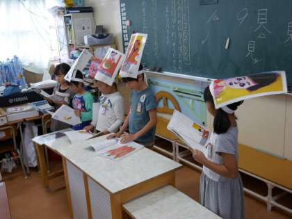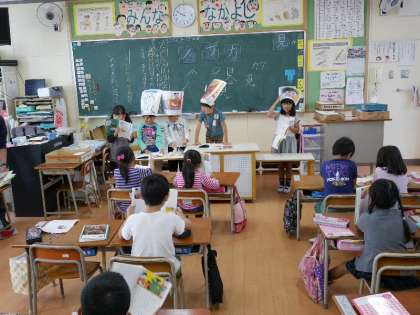 1年生がそれぞれの役になりきって国語の本を皆で読んでいます。しっかりと声がでているかな。