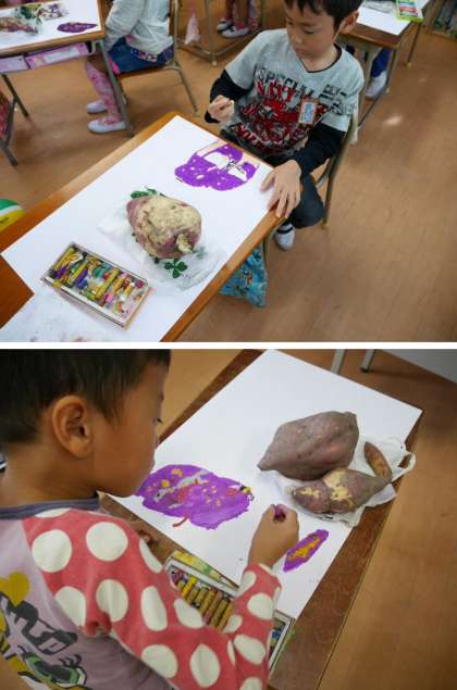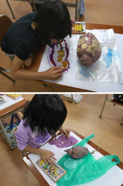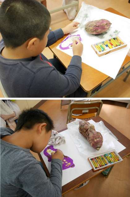 おおおきなサツマイモを真剣にみつめ絵を描く2年生