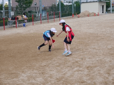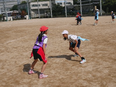 5年生がフラッグフットボールの練習をしています。なかなかハンカチをとることができませんね。