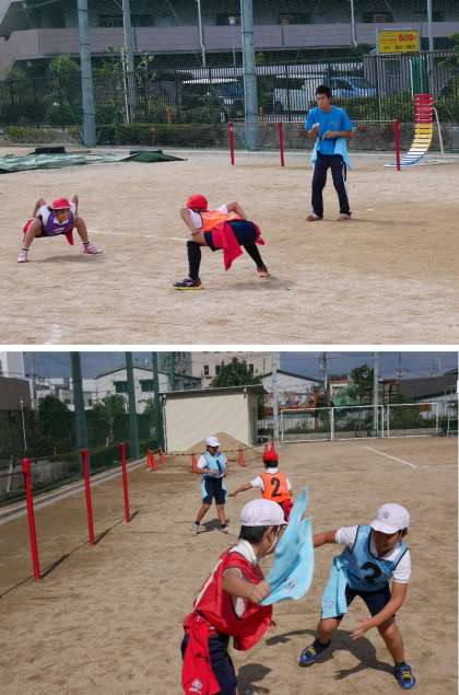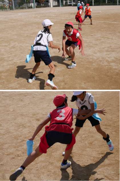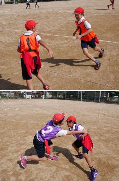 5年生がフラッグフットボールの対戦練習をしています。まずは、二人一組で身体につけたハンカチをうばいあいます。フラッグフットボールはラグビーを簡単に安全にしたゲームです。楽しんで競技できるといい運動になりますね。