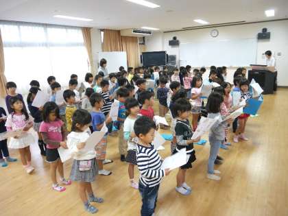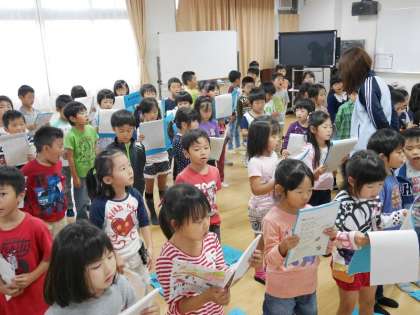 1年生合同で音楽発表会の練習をしています。初めての体験ですね。小学生になって成長してきたところを、おうちの方にみていただけるといいですね。