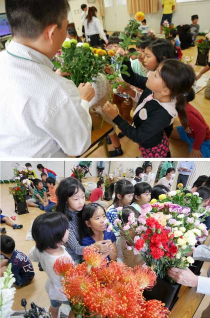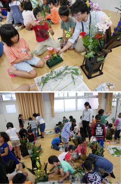 今日、ブロッサムにある「なにわ花市場」の卸売市場に集まったお花は、なんと、1日で65種類165万本だそうです。すごいですね。日本で2番目に大きなお花の市場なんです。そこから、お花をもってきていただき、皆で花のアレンジを体験しました。たくさんの花を選んで、班で生け花をします。「きれい」との声をだしながらがんばっていました。よいアレンジができあがりましたね。
