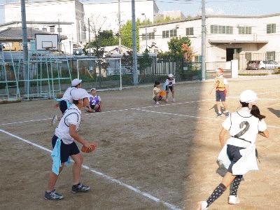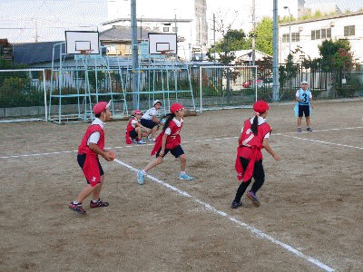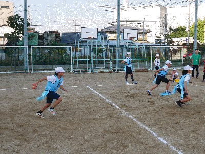 フラッグフットボールのルールをおぼえて、試合で対戦です。迫力ある走りでがんばっています。試合のあいだにはチームで作戦をねって、コミュニケーションをとって皆で考えています。