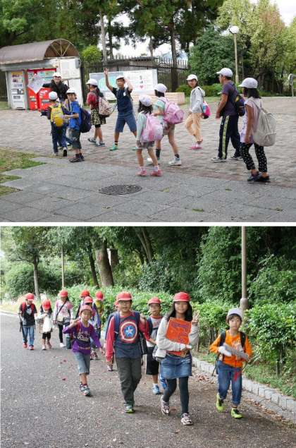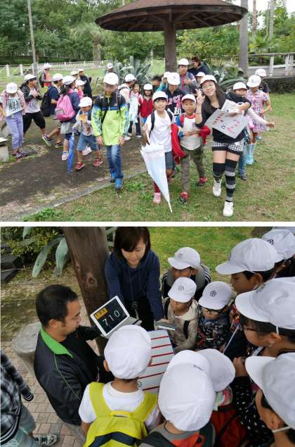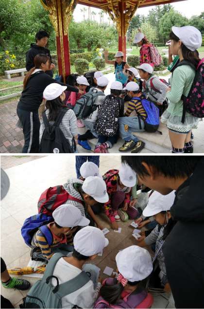 オリエンテーリングがスタートしました。広い鶴見緑地を地図をみながらポイントをさがしてつきすすみます。ポイントでは先生がクイズや、数字をおぼえて答えたり、しりとりをしたりします。班でもりあがってとりくんでいます。