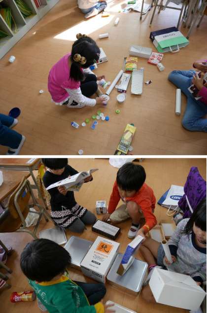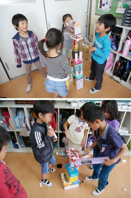 1年生が算数で「かたちあそび」をしていろいろなものをつくっています。家からもちよった箱をつみあげてタワーを作っているチームもありますね。どんな大きさの形のものをどの順番でつみあげたらいいか、みんなで話し合いながらがんばっています。