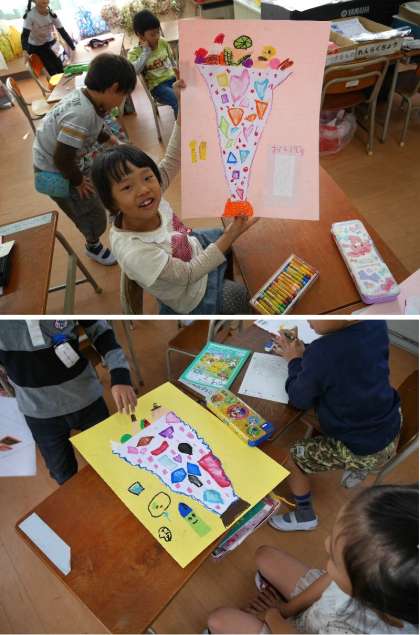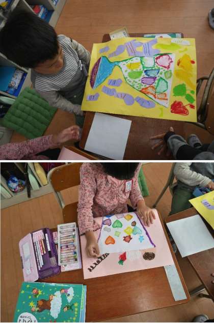 1年生が描いている「びっくりカフェ」がだんだんかたちになってきましたね。イチゴやスイカをトッピングしておいしそうです。