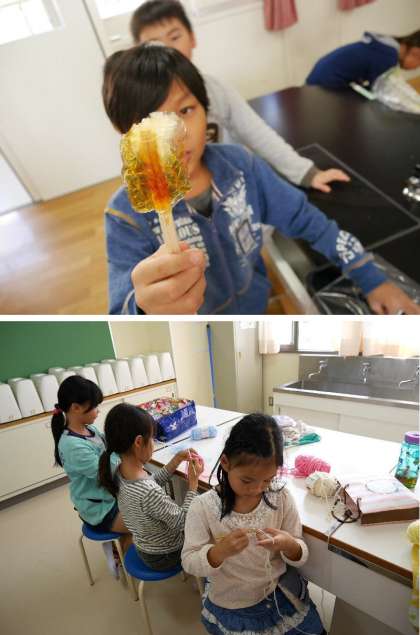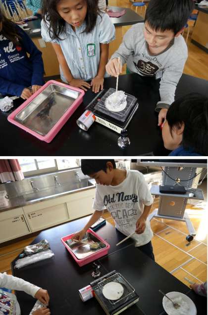 クラブ活動の理科部は「べっこうあめ」を砂糖からつくっています。こがしすぎると少し苦くなります。よい加減で割りばしをつけて固めます。おいしくできたかな。