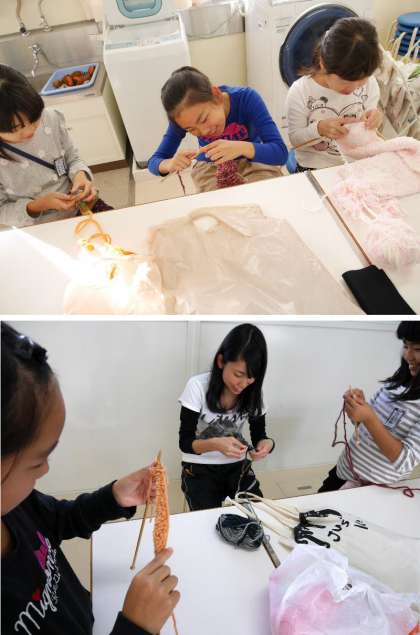 家庭科室では、編み物を一生懸命にしています。かぎ針チームと棒針チームにわかれて、ぎこちない手つきですが、ひと目ひと目編んでいます。