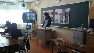 はじめに、茨田北小栄養教諭の林先生から、学校給食の目標やねらい、食の安全や栄養のバランスなど、食育の基礎となるお話を聞きました。