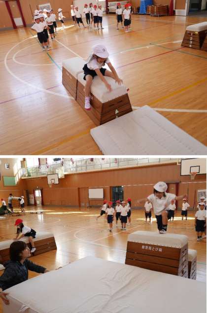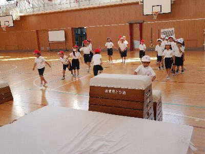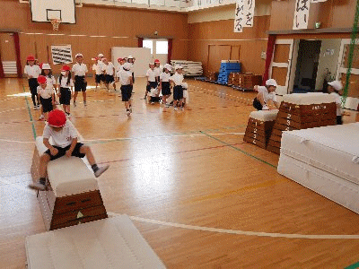 1年生が体育館で運動しています。跳び箱をこえてマットに着地!楽しそうにつぎつぎととびこしていきます。かっこよく跳べてるかな。