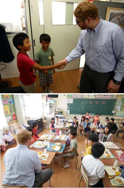 今日は3年生の教室で給食を英語のメイソン先生が一緒に食べてくれました。校長室に3年生がメイソン先生を迎えにきてくれました。さっそく握手で英語のあいさつをレッスン。3年生は質問するのも少し消極的ですが、給食後にはサインももらいに長蛇の列です。「プリーズ サイン。サンキュー」と簡単な英語でお願いしました。