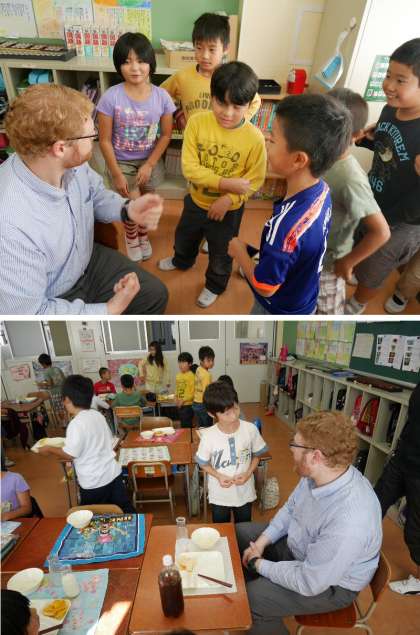 英語ネイティブC-NET先生が給食にやってきた。3年生