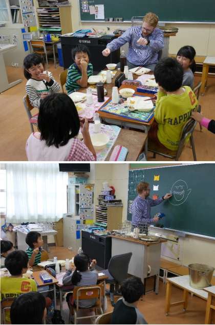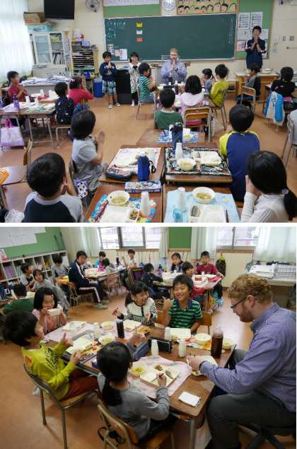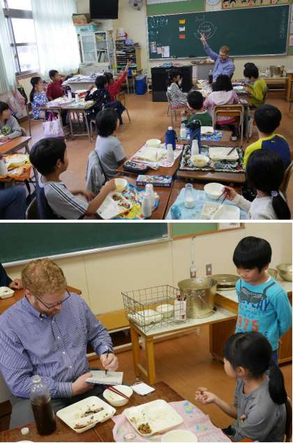 英語ネイティブの先生が給食にきたよ!3年生はうきうき