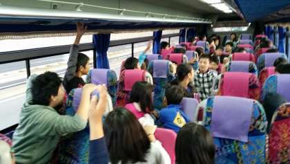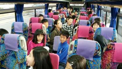 無事高速に乗りました。少し渋滞気味ですが、子どもたちはそんなこともお構いなしに、車中では早速この日のために考えたバスレクで盛り上がっています。