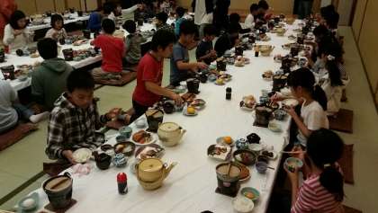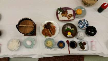 入浴の前の夕食です。このホテルのモットーは「食事に関して、足りなかったとは言わせない」だそうです。その言葉通りたくさんの料理が目の前に並んでいます。とても豪華なメニューなので食べきることができるか心配ですが、しっかり食べてこの後の行事にそなえます。