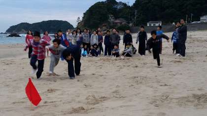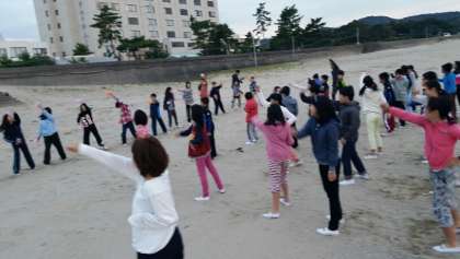 おはようございます。修学旅行2日目のスタートです。6時に起床後、海岸で朝会をし体ほぐしの体操を行いました。また、みんなで、ビーチフラッグ競技をして楽しみました。波ぎわで裸足で走って青春もしました。少し海の水が冷たかったけど、とてもいい思い出になりました。今年も残念ながら日の出が見られませんでしたが、水平線が幻想的できれいでした。