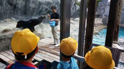 鳥羽水族館を見学しています。マナティやアシカなど、ふだん目にすることのない珍しい生き物にみんな興味津々です。一人ひとりの子どもが目を輝かせながら、それぞれの思いを胸に活動をしています。