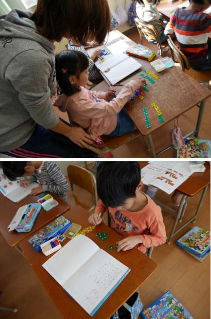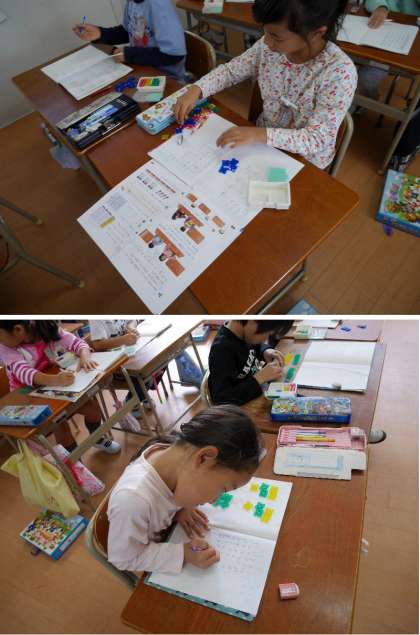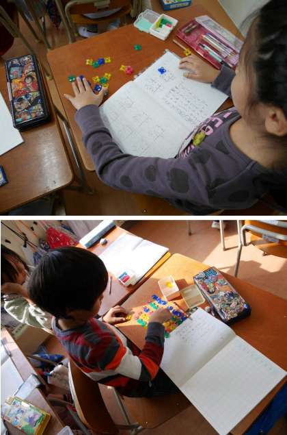 2年生ではいよいよかけ算の学習が始まりました。1〜5までのかけ算を、おはじきをならべて、かけ算をしています。「1つ分の数はいくつですか。また、それがいくつ分ありますか」と3×2を考えています。その並べ方でよいわけを考えていきます。九九をおぼえていくことにつながっていくのですね。