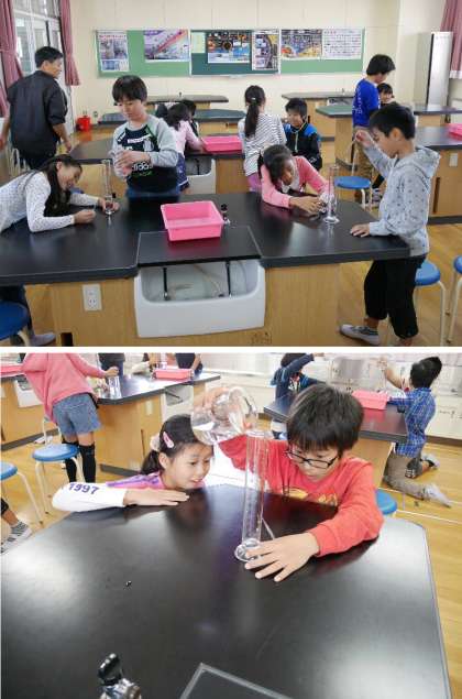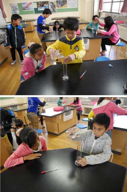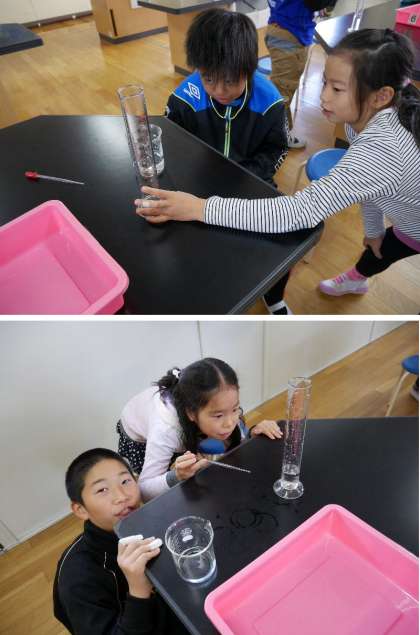 5年生の理科では「もののとけ方」を学習しています。その実験のために、まずメスシリンダの使い方を練習しています。水を入れると目盛の両端が浮き上がってみえるんですね。真横から見て真ん中の水平線の目盛にスポイトで水を正確に入れる練習をしています。