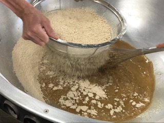 大阪市の学校給食では、ハヤシライスやシチューのルウは給食室で手作りしています。小麦粉をていねいにふるって褐色になるまで炒め、油を加えてさらに色付くまで加熱し、ブラウンルウを作ります。牛肉と野菜を煮込んだ釜に、ケチャップ・トマトピューレを入れ、ルウや塩・こしょう、デミグラスソース等で味付けしさらに煮込みます。コクがあり、とてもおいしいハヤシライスに仕上がりました。