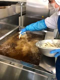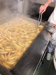 わかさぎは骨まで柔らかく、こどもにも食べやすい魚です。給食室で、冷凍のわかさぎをあざやかな手さばきで揚げていきます。大型フライヤーで、一回揚げるごとに中心温度を測定します。